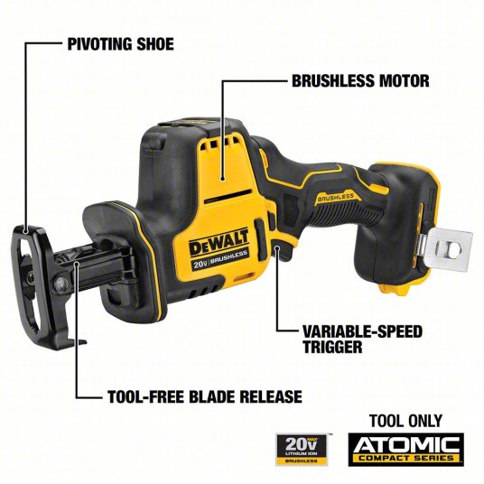 These DEWALT cordless reciprocating saws are powered by DEWALT-brand rechargeable batteries. Brand-specific batteries can often be used with a variety of cordless tools by the same brand/manufacturer that use the same battery series and voltage. Cordless reciprocating saws are used when access to a wired power source is not available, making them more portable than corded saws. They are used for demolition, construction, and metal fabrication tasks.