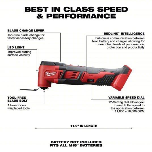 MILWAUKEE 2626-20 Oscillating Tool: 11,000 to 18,000, 3.2° Oscillation Angle, Accessory Free Tool Change, 18V