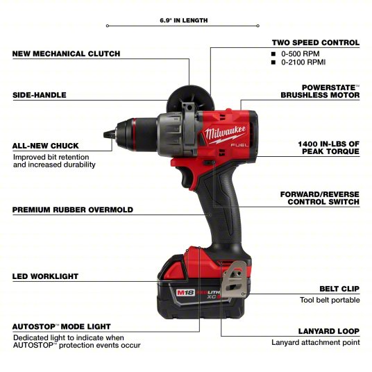 MILWAUKEE 2803-20 Drill: 18V DC, Compact Premium, 1/2 in Chuck, 2,000 RPM Max., 1,200 in-lb Max Torque